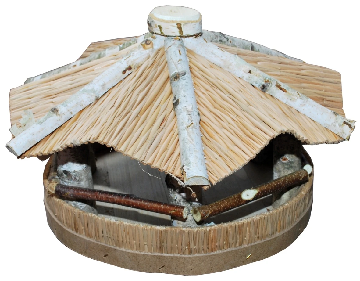 Futterhaus aus Birkenholz mit Strohdach